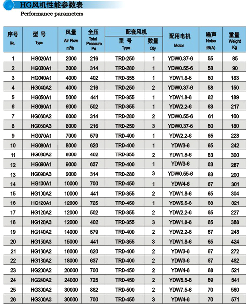 性能參數表 HG |