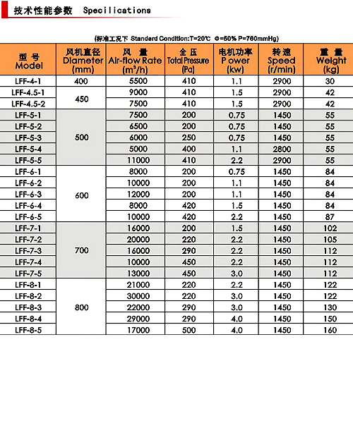 本系列風機葉輪直徑由小到大共分為4、4.5、5、6、7、8等六種機號,風量5500~30000m3/h,風壓200~500Pa(詳見參數表)。