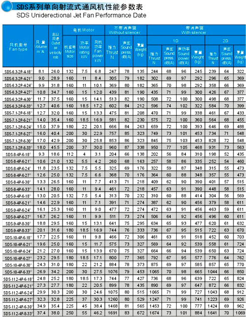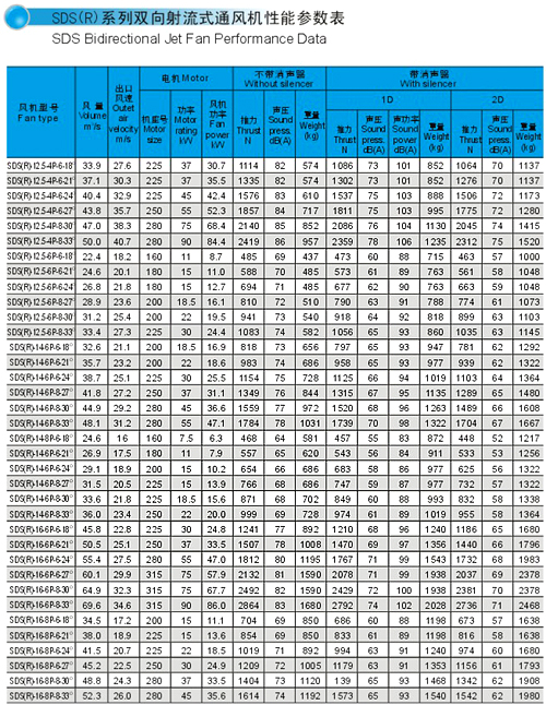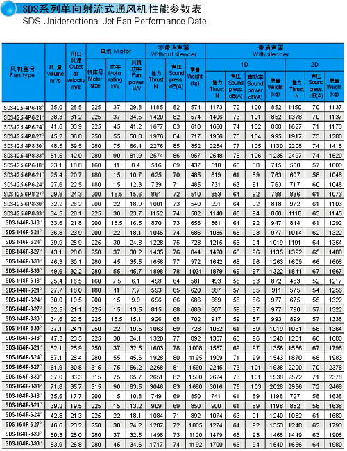 SDS系列射流風機規格自Φ630㎜~Φ1600㎜,分單向運轉軸流風機和可逆式(雙向)運轉軸流風機二大類,最大推力達到3500N,對于絕大部分負荷和工況均可選擇此類高效、低噪聲風機。